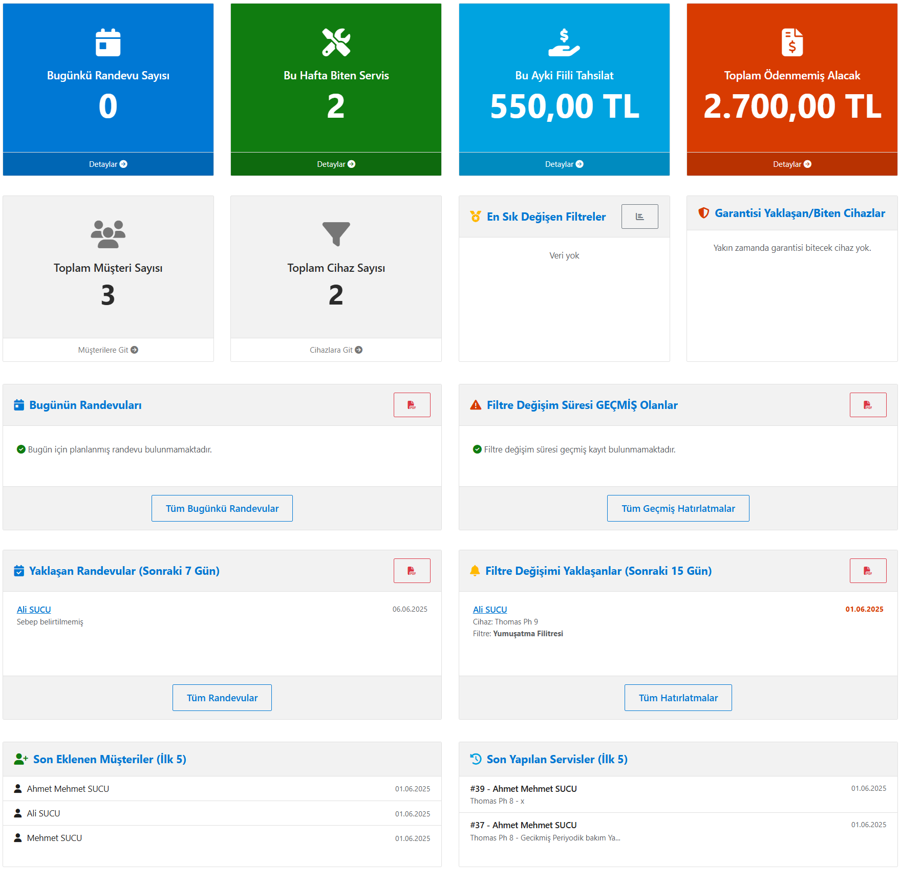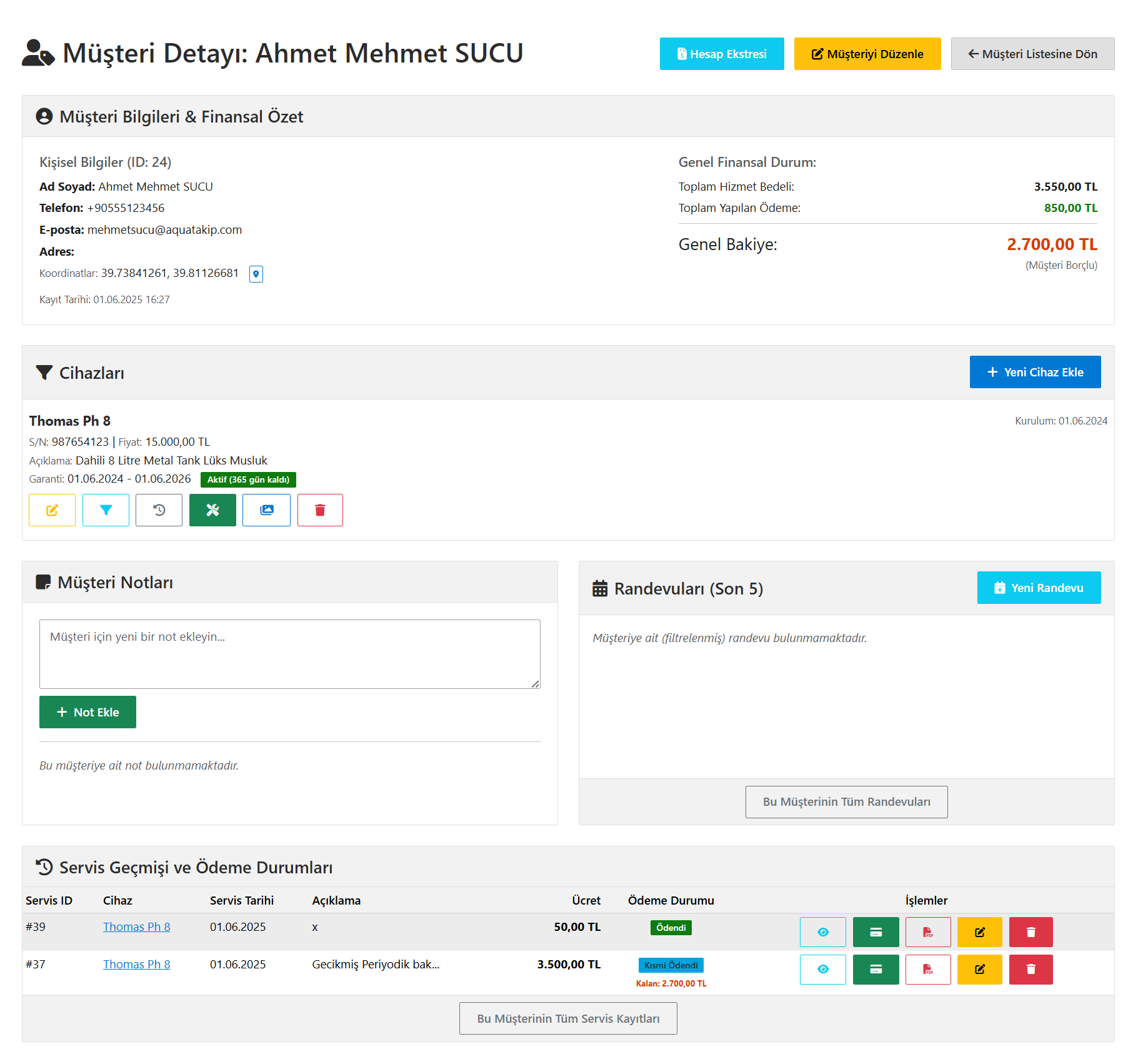 Detaylı Müşteri Sayfası - AquaTakip Ekran Görüntüsü