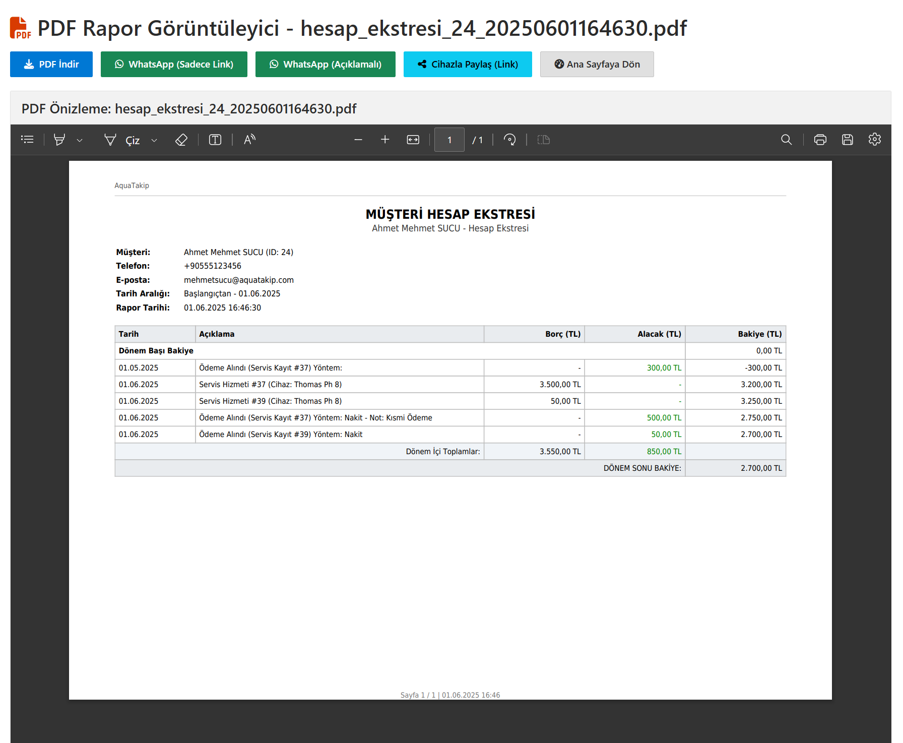 Örnek Hesap Ekstresi (PDF) - AquaTakip Ekran Görüntüsü