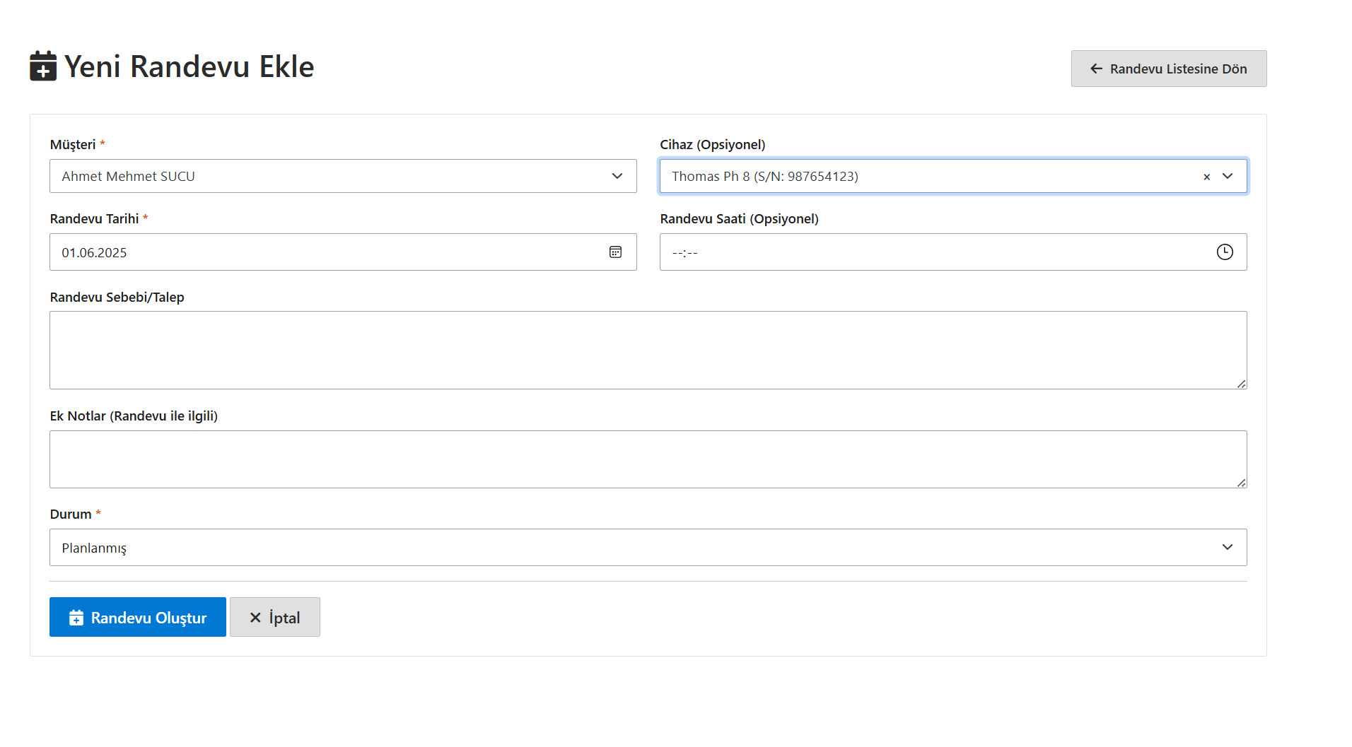Kolay Randevu Ekleme Formu - AquaTakip Ekran Görüntüsü