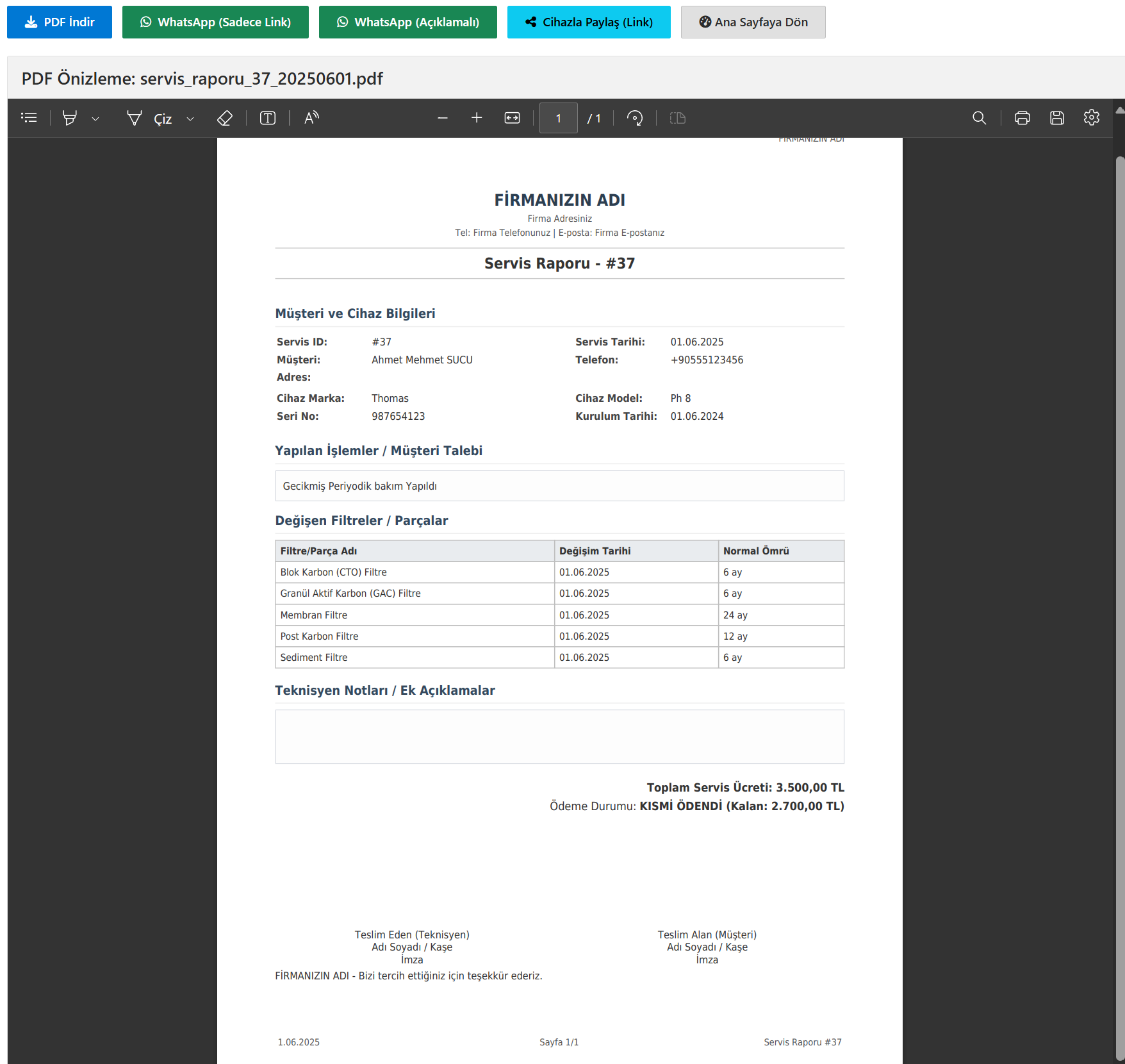Örnek Servis Raporu (PDF) - AquaTakip Ekran Görüntüsü